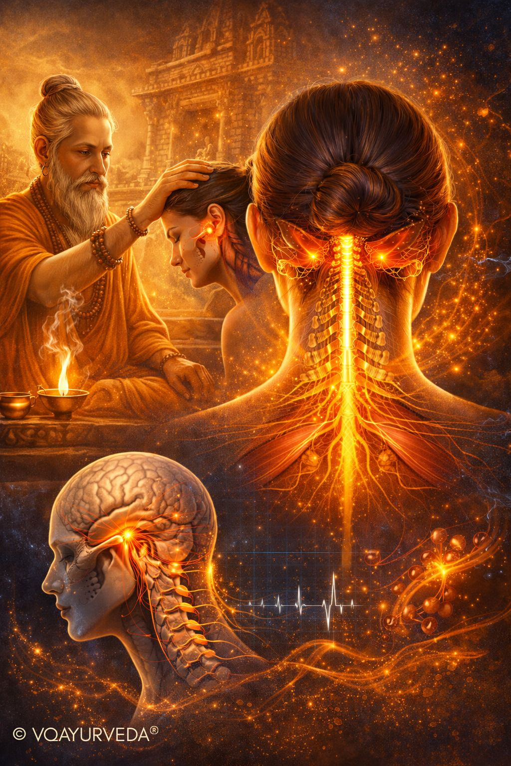 When Vata is dysregulated, tension accumulates where mobility and stability meet—most notably at the upper cervical region.
